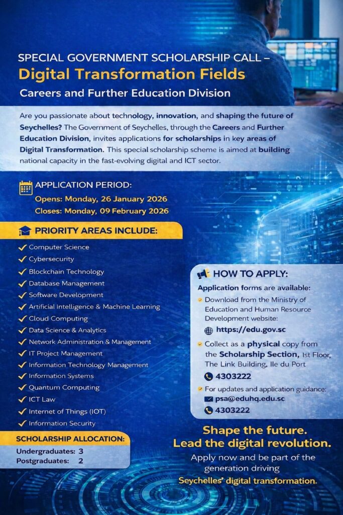 The Government of Seychelles through the Career and Further Education Division, is inviting applications for scholarships in key areas of Digital Transformation. Five scholarships are being offered, 3 Undergraduate and 2 Postgraduate programmes.
